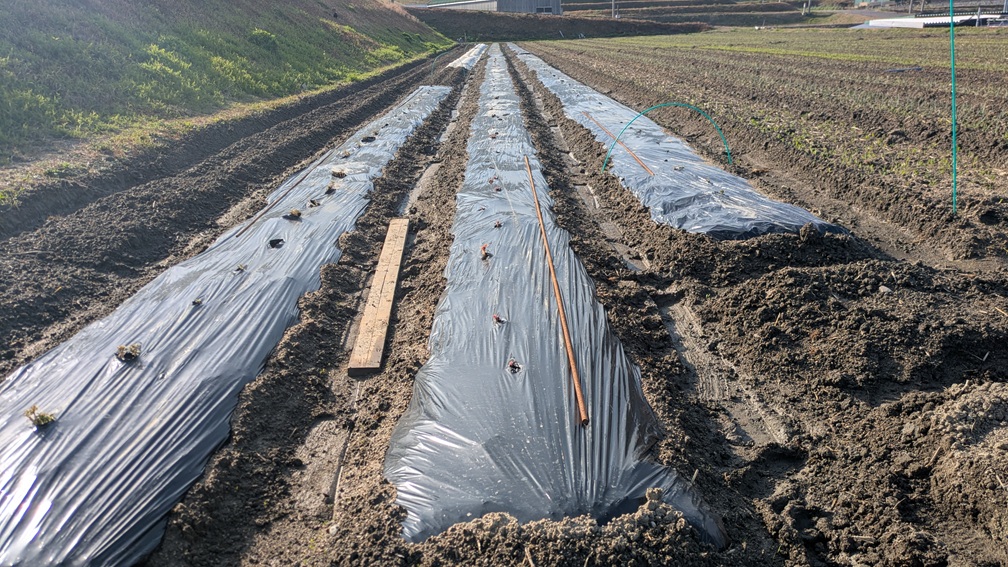 前回、管理機作業を行ったときは、土が固くてできなかったので、昨日の雨はこの作業をするのにピッタリの水分量です。