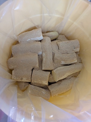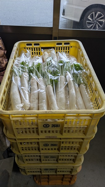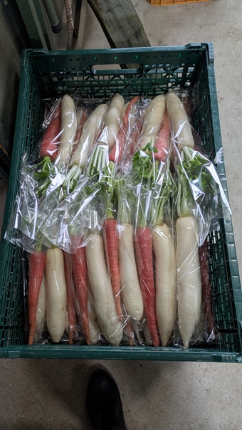 ↑大根は、今年、虫食いの部分を取り除いてから漬物にしたのでこんなに短いものばかり。