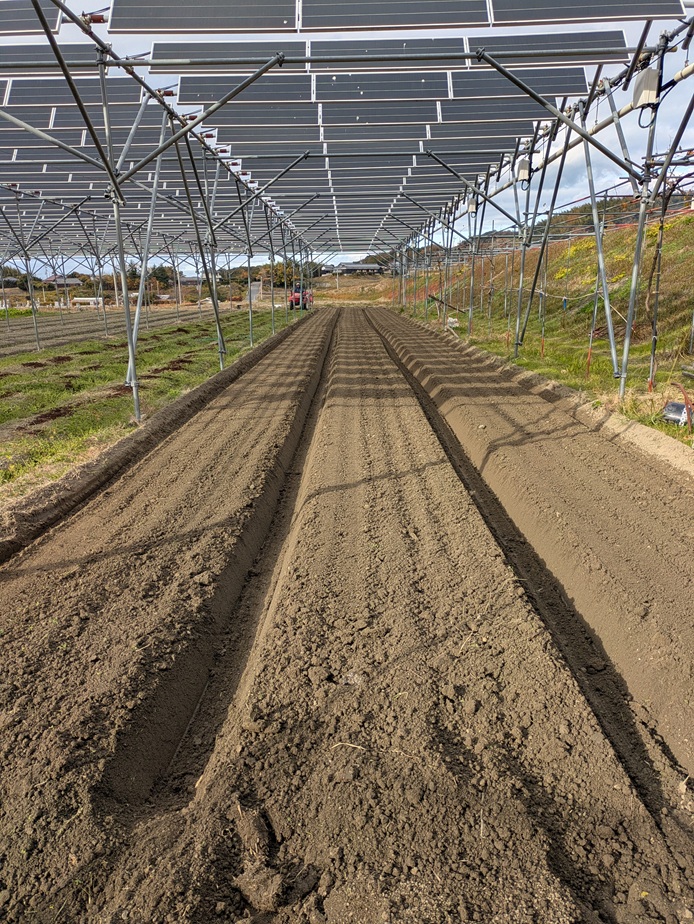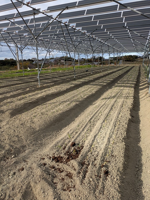 先週末、大和大学の学生さん達が定植してくれました。ほとんど苗は見えていませんが、↑の写真は定植済みの畝(うね)です。