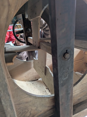 ↑ハンドルを回すと中の板の羽が回って風をおこし、上から落ちてくる蕎麦やゴミを風で飛ばします。