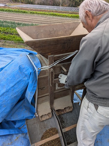 次は、唐箕(とうみ)を使って、ゴミなどを風で飛ばし、蕎麦の実だけを収穫します。