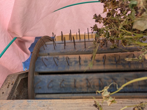 まず、蕎麦の実を枝から外します。足踏み脱穀機を使います。